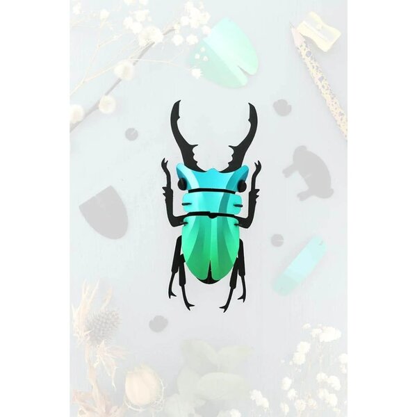 - Dieses 3D-Puzzle-Kit enthält alle Teile, um die Grüne Hirschkäfer zusammenzubauen. Der Käferkörper besteht aus schwarzem Karton. Die Schildteile sind aus rosa Metallpapier.