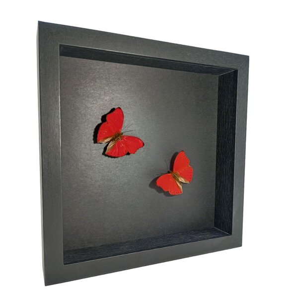 Die Schmetterlinge werden in einem schwarzen Holzrahmen mit schwarzem Hintergrund präsentiert, wodurch die tiefen Rottöne noch stärker zur Geltung kommen. Auch in einer dekorativen Glasglocke erhältlich. Perfekt als natürliche Wanddekoration oder stilvolles Wohnaccessoire.