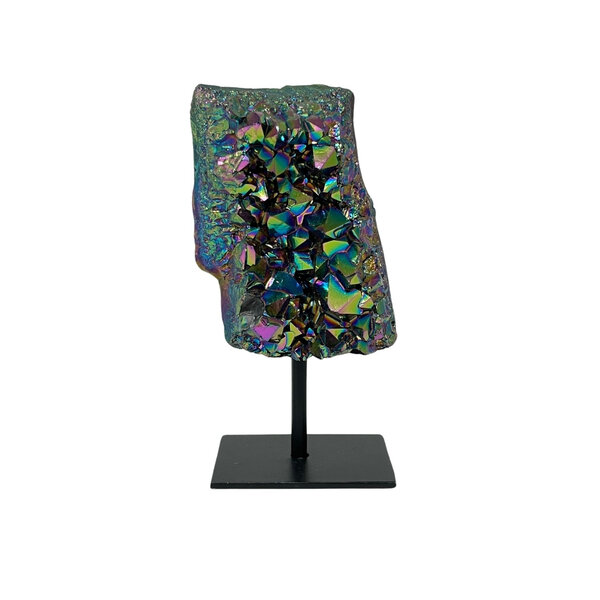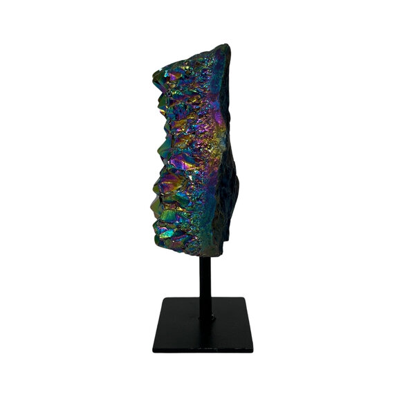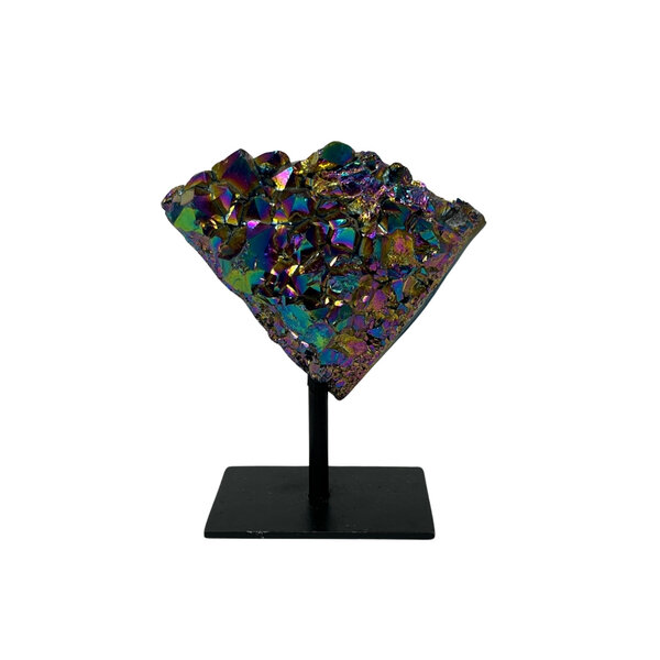 Flame Aura Quartz is an Clear Quartz that consists titanium and gold. It brings energy, excitement and a motivation for life. It is said to be good at alleviating sadness and depression.