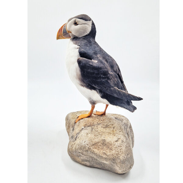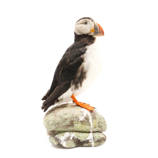 Beautiful mounted puffin on rock.