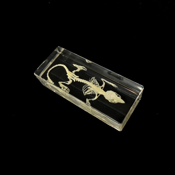 Mouse skeleton in clear resin, carefully prepared with visible feather pattern and shape. A unique and educational object for nature lovers and collectors.