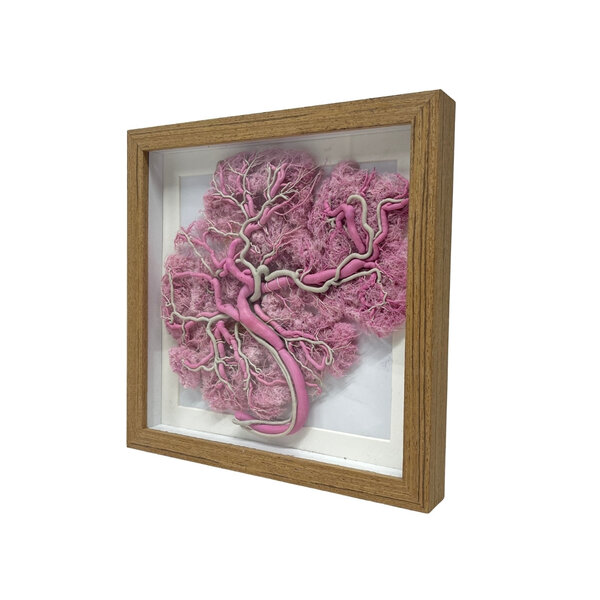 Dit bijzondere preparaat toont het vaatstelsel van een menselijke placenta, zichtbaar gemaakt door middel van een corrosiepreparaat (corrosion cast). Bij deze preparatietechniek wordt het netwerk van bloedvaten gevuld met een speciale hars. Vervolgens wordt het omliggende weefsel opgelost, waardoor een gedetailleerde afdruk van het vaatstelsel overblijft.